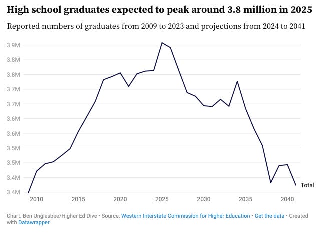 This May, the U.S. will graduate its largest ever high school graduating class, with falling fertility rates driving the number down every year going forward. Over the coming decade the shortfall in new entrants to the labor market will create structural labor shortfalls which either force companies to automate or compete more for the declining talent pool.