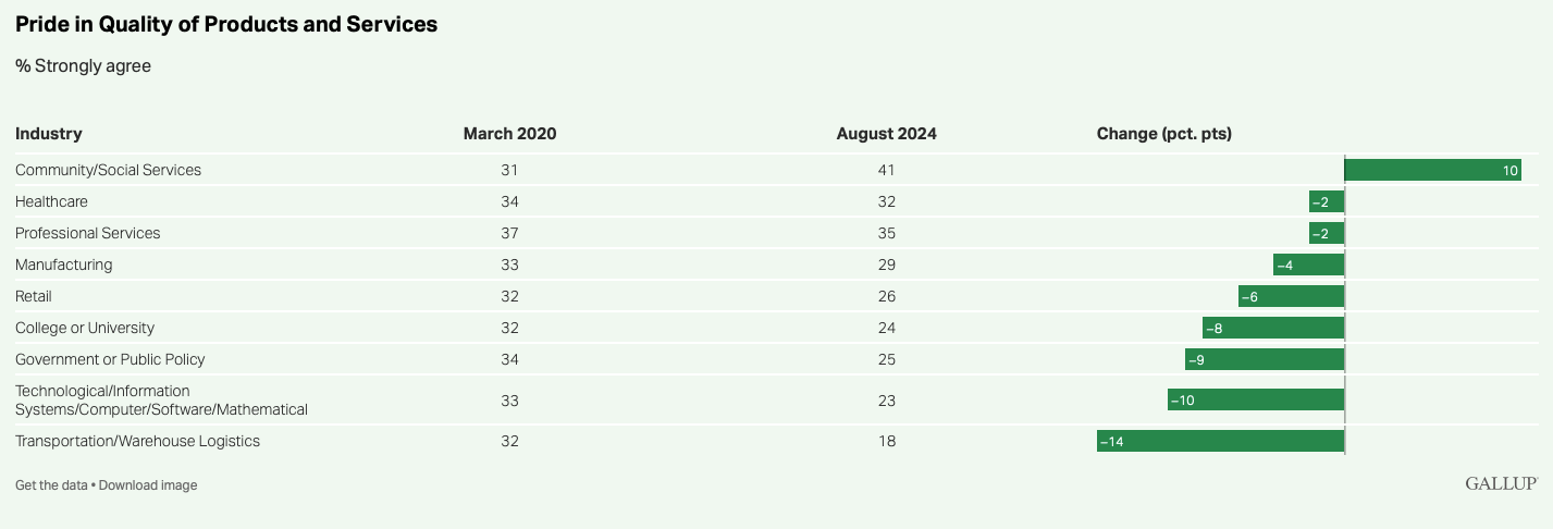 Employee pride in their organizations' products and services has plummeted to match historical lows, with only 28% of workers reporting strong pride in their company offerings - a trend that's particularly pronounced in transportation, technology, and government sectors.