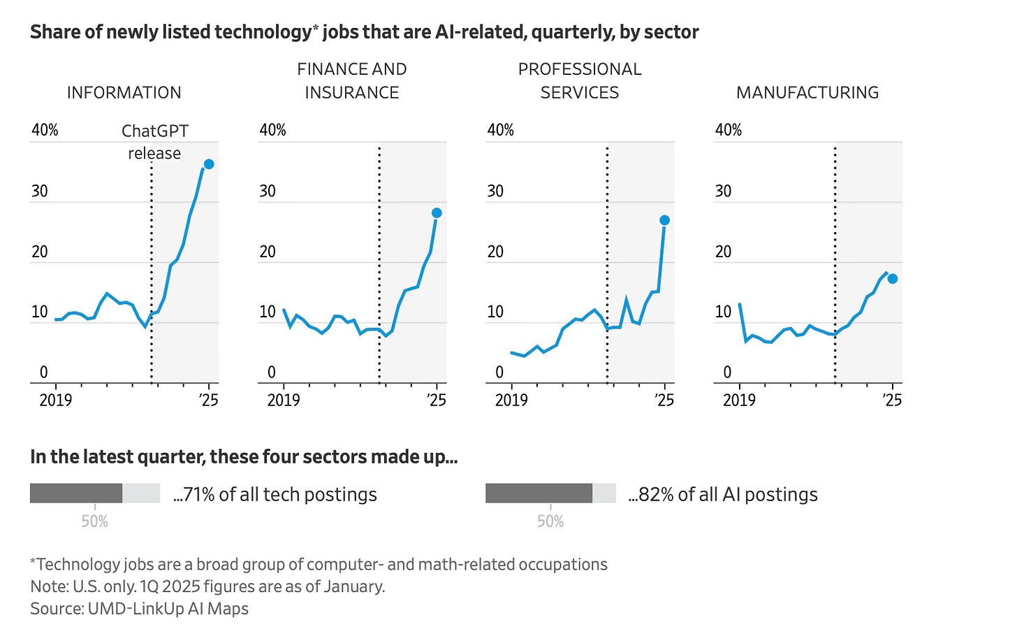 Employers across sectors are scrambling to secure AI talent, with nearly one in four U.S. tech job listings now requiring artificial intelligence skills, according to recent data. This represents a 68% increase in AI-related postings since ChatGPT's late-2022 debut. The surge extends beyond traditional tech companies, with financial services increasing AI training by 75% in Q4 alone, while manufacturing (50%), transportation (11%), and government (8%) also show significant growth.