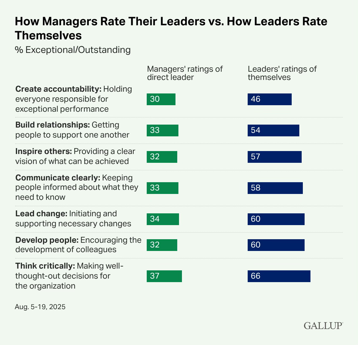 There is a 20-point gap between how leaders rate their own ability to create accountability and how their managers rate them. That is a performance problem. A recent Gallup study of seven core leadership competencies found that “create accountability” was the lowest-rated skill for both leaders and managers—and the one with the largest gap between leaders’ self-perception and the reality their teams experience.