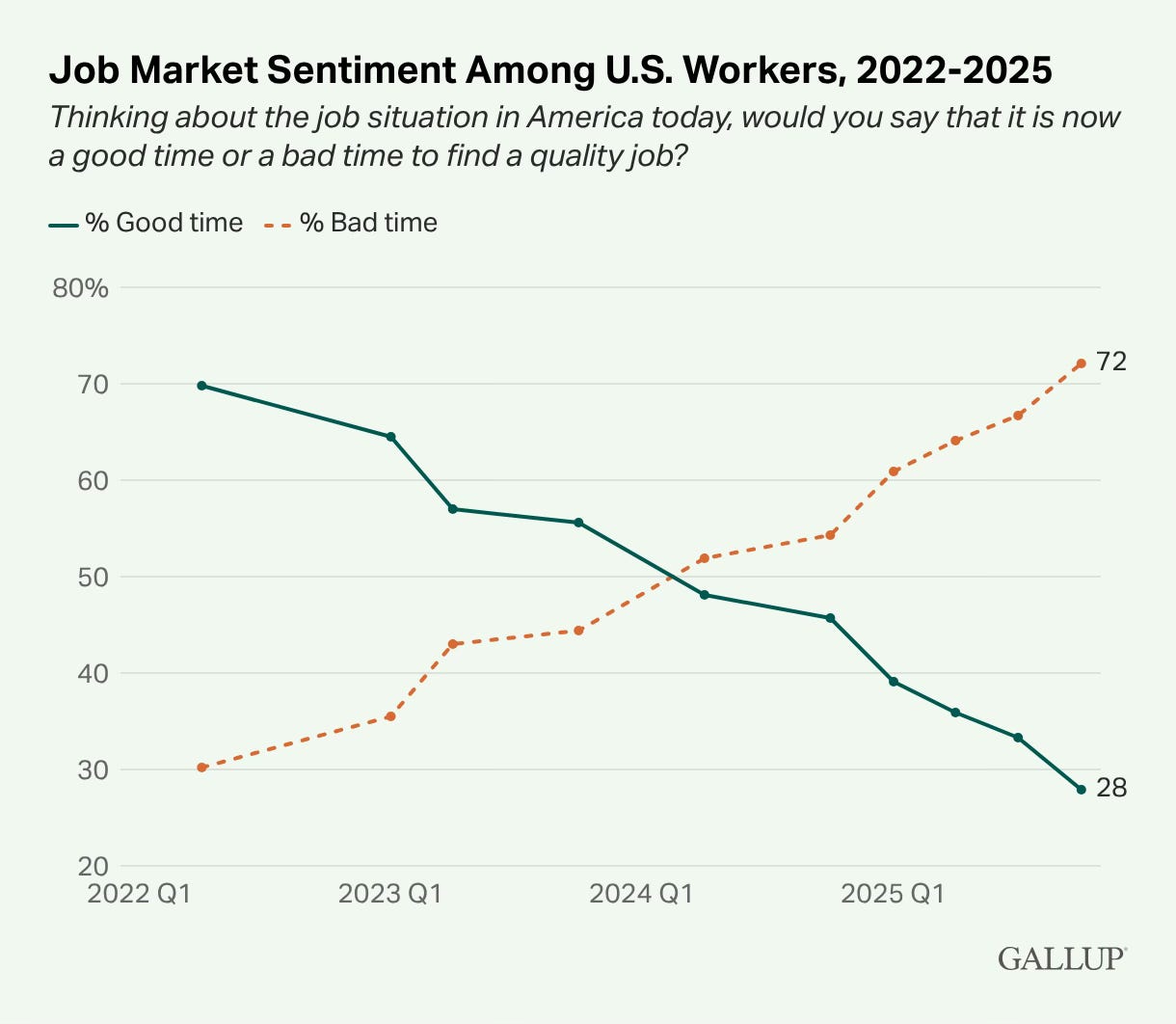 Your employees are terrified. The data is unambiguous: for the first time, more U.S. workers are struggling than thriving, according to Gallup’s Q4 2025 survey. Worker engagement is at a decade low, and just 28% of workers say now is a good time to find a quality job, down from 70% in mid-2022. Globally, only 22% of workers feel their job is safe from elimination, per ADP’s survey of 39,000 workers. The workforce is restless but stuck, a combination that creates quiet deterioration.