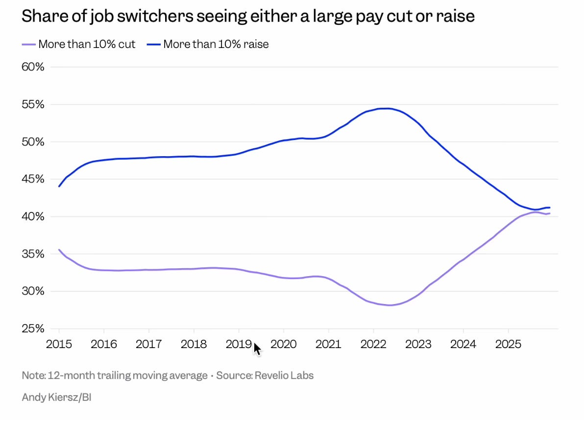 Among white-collar workers who changed jobs at the end of last year, 40% took salary cuts of more than 10%, the highest share in a decade, per Revelio Labs. With long-term unemployment nearly doubling in three years, employers are requiring more experience for open roles. For workers who accept a pay cut, the consequences compound, as future raises and offers are anchored to a lower base.