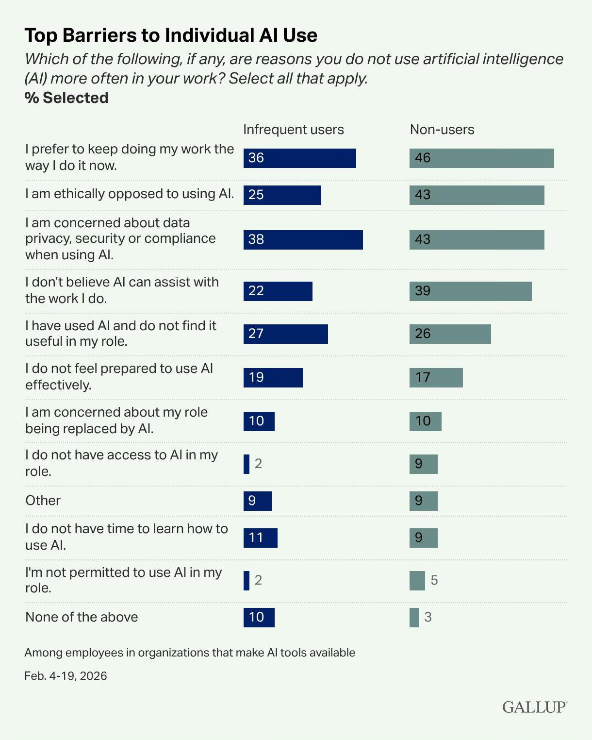 Manager support: Gallup data shows employees whose managers actively champion AI are nearly twice as likely to use it frequently.