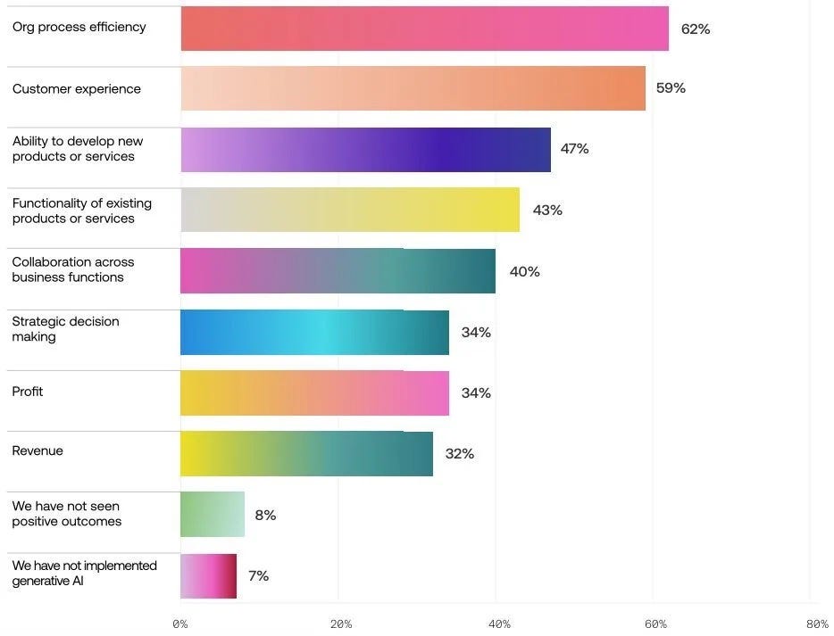 The real impact of an often intangible technology is already evident. More than 60% of US businesses report improved efficiency, and 59% experience enhanced customer experience. Moreover, nearly half of the respondents attribute the generation of ideas for new products or services to language models, showcasing AI's ability to foster innovation and creativity within organizations. While the impact of AI on profitability and revenue is still unfolding, only 8% of organizations reported no improvements across the board, indicating that the vast majority are reaping the benefits of AI in some capacity.