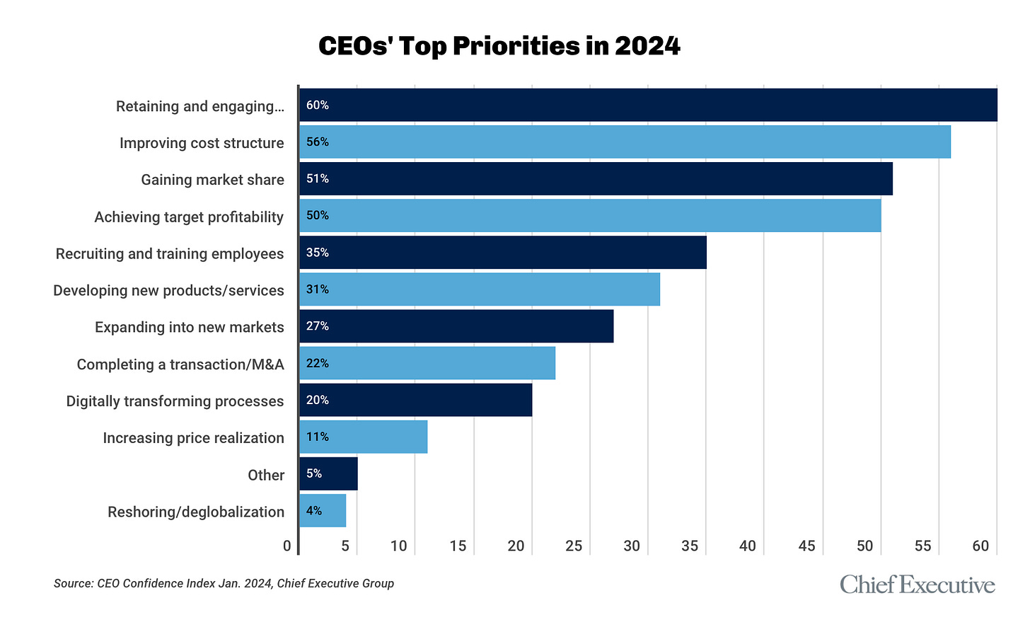 Recent prominent layoffs might suggest the balance of power has shifted back to employers. But most CEOs say retaining and engaging staff is still their top priority for 2024, according to a new survey by Chief Executive: 60% of CEOs ranked it number one, even higher than 2 years ago. With skilled talent still scarce, employee focus remains critical.